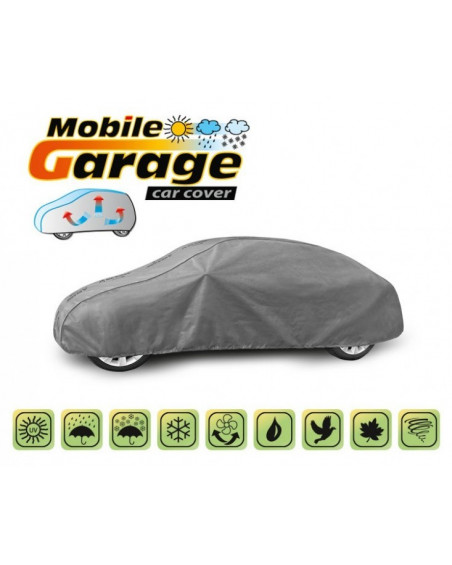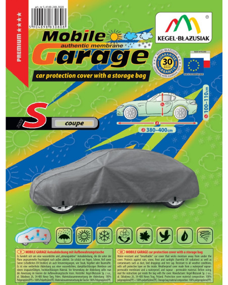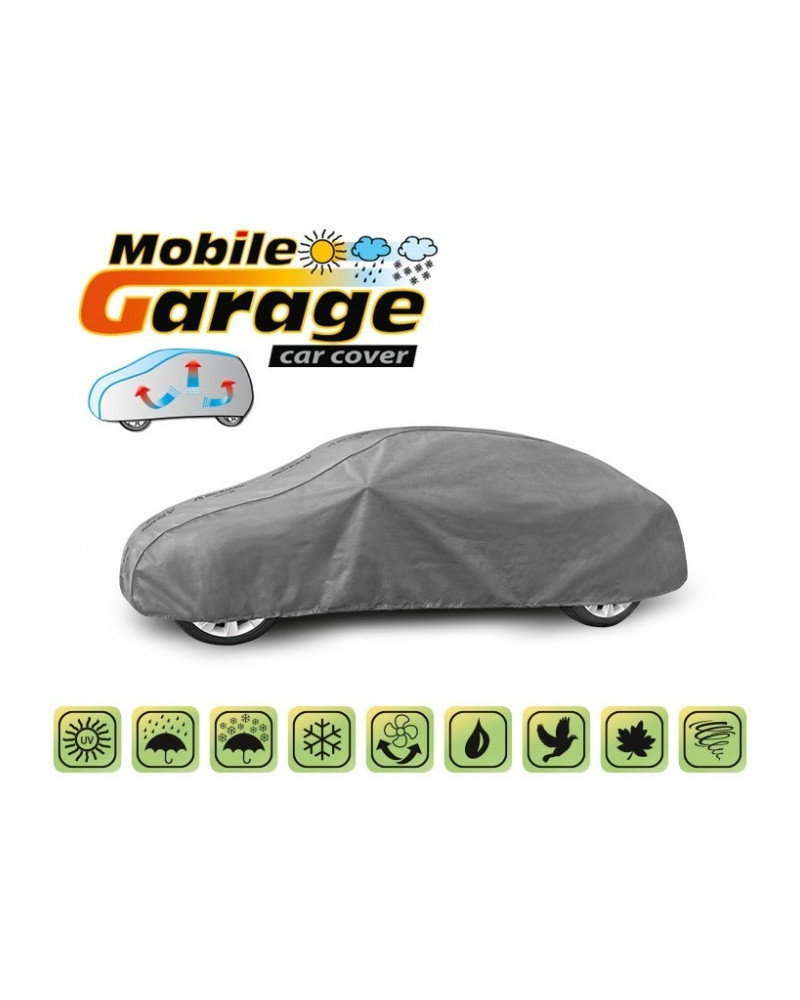 La housse de MOBILE GARAGE de haute qualité est un produit adapté aux besoins des conducteurs. Elle est composée de 4 couches de matériaux épais, solides et durables. La housse protège l'ensemble de la voiture contre les influences néfastes de l'environnement. La housse Mobile Garage est la protection idéale pour votre véhicule tout au long de l'année. Sa fonctionnalité peut être appréciée en toute saison. En hiver, il empêche l'accumulation de neige, de givre et de glace et résiste au gel ; en automne, il protège contre la pluie, le vent, les feuilles, la sève des arbres ; et en été et au printemps, il protège contre les rayons UV, la poussière et les fientes d'oiseaux. Les propriétés particulières du matériau multicouche garantissent que la housse ne se mouille pas, tout en permettant à la vapeur d'eau de s'échapper du dessous de la housse vers l'extérieur. Toute trace d'humidité qui s'accumule sous la bâche s'évapore rapidement, évitant ainsi la rouille de la voiture et la formation de moisissures. La housse convient à une utilisation immédiate ou à long terme. La housse peut être lavée à la main à 40 degrés.