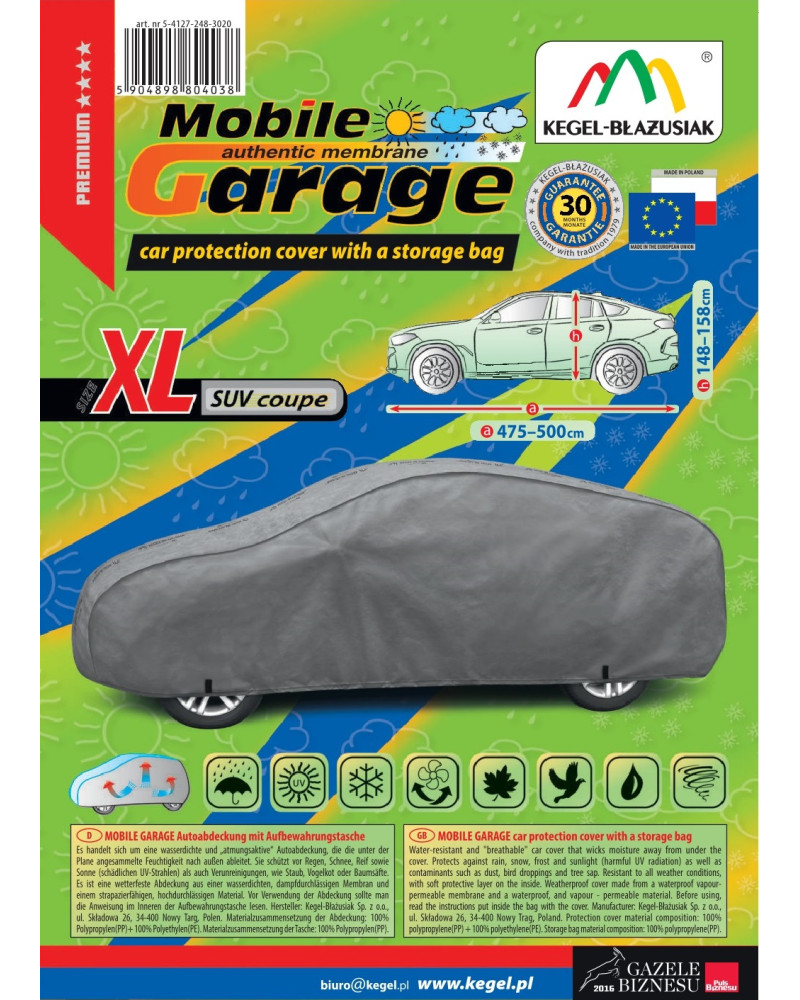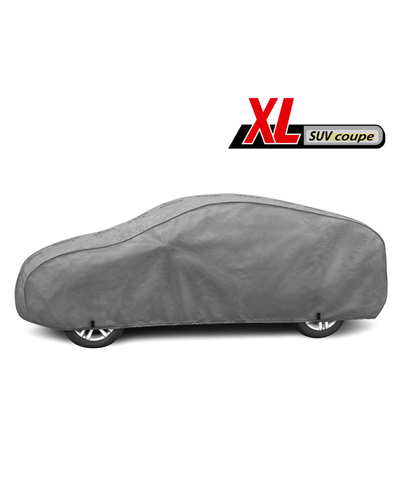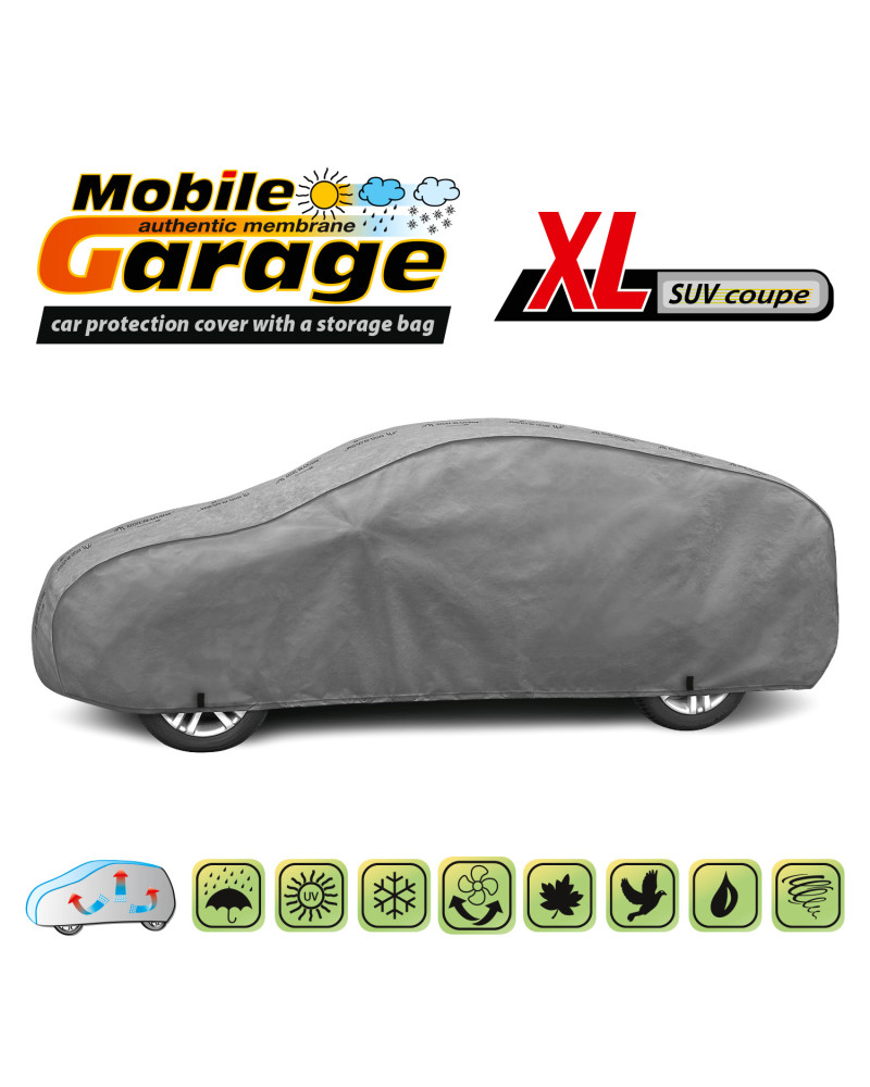 La housse de MOBILE GARAGE de haute qualité est un produit adapté aux besoins des conducteurs. Elle est composée de 4 couches de matériaux épais, solides et durables. La housse protège l'ensemble de la voiture contre les influences néfastes de l'environnement. La housse Mobile Garage est la protection idéale pour votre véhicule tout au long de l'année. Sa fonctionnalité peut être appréciée en toute saison. En hiver, il empêche l'accumulation de neige, de givre et de glace et résiste au gel ; en automne, il protège contre la pluie, le vent, les feuilles, la sève des arbres ; et en été et au printemps, il protège contre les rayons UV, la poussière et les fientes d'oiseaux. Les propriétés particulières du matériau multicouche garantissent que la housse ne se mouille pas, tout en permettant à la vapeur d'eau de s'échapper du dessous de la housse vers l'extérieur. Toute trace d'humidité qui s'accumule sous la bâche s'évapore rapidement, évitant ainsi la rouille de la voiture et la formation de moisissures. La housse convient à une utilisation immédiate ou à long terme. La housse peut être lavée à la main à 40 degrés.