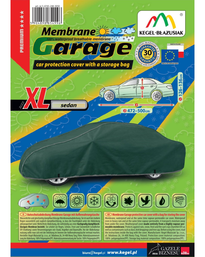 De bonnes housses de protection - bâches doivent, non seulement protéger la voiture contre les précipitations, les impuretés et le rayonnement solaire, mais aussi être sûres. C’est exactement ce qui caractérise nos housses de protection - bâches Kegel-Blażusiak. Nos spécialistes effectuent des tests à long terme de nos housses de protection – bâches. L’efficacité de la protection du véhicule par la housse de protection – bâche contre les conditions météorologiques, la résistance à l’eau, l’évacuation de la vapeur d’eau du dessous de la housse, la sécurité de la housse de protection pour la couche de peinture du véhicule anisi que l’efficacité de la fixation de la housse de protection sur le véhicule dans des conditions météorologiques normales et extrêmes, sont testés. Seuls les produits dont les tests à long terme ont été achevés avec succès, sont fabriqués par notre société Kegel-Blażusiak.