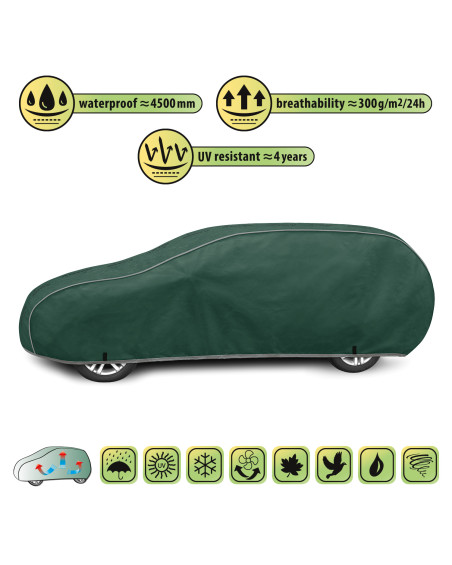 La housse de protection voiture de membrane, imperméable mais en même temps perméable à la vapeur. Housse iImperméable même en cas de forte pluie et en même temps perméable à la vapeur, évacuant l'humidité du dessous de la housse vers l'extérieur. La housse résistante aux intempéries, entièrement composée d'une membrane à très haute perméabilité à la vapeur. Elle protège contre la pluie, la neige, le gel et le rayonnement solaire (rayons UV nocifs) et contre les impuretés telles que la poussière, les fientes d'oiseaux et les sèves d’arbres.