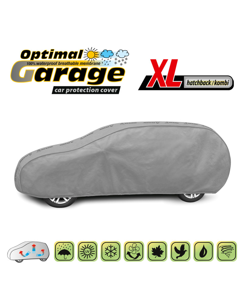 La housse de protection voiture de membrane OPTIMAL GARAGE, imperméable mais en même temps perméable à la vapeur. Housse iImperméable même en cas de forte pluie et en même temps perméable à la vapeur, évacuant l'humidité du dessous de la housse vers l'extérieur. La housse résistante aux intempéries, entièrement composée d'une membrane à très haute perméabilité à la vapeur. Elle protège contre la pluie, la neige, le gel et le rayonnement solaire (rayons UV nocifs) et contre les impuretés telles que la poussière, les fientes d'oiseaux et les sèves d’arbres.