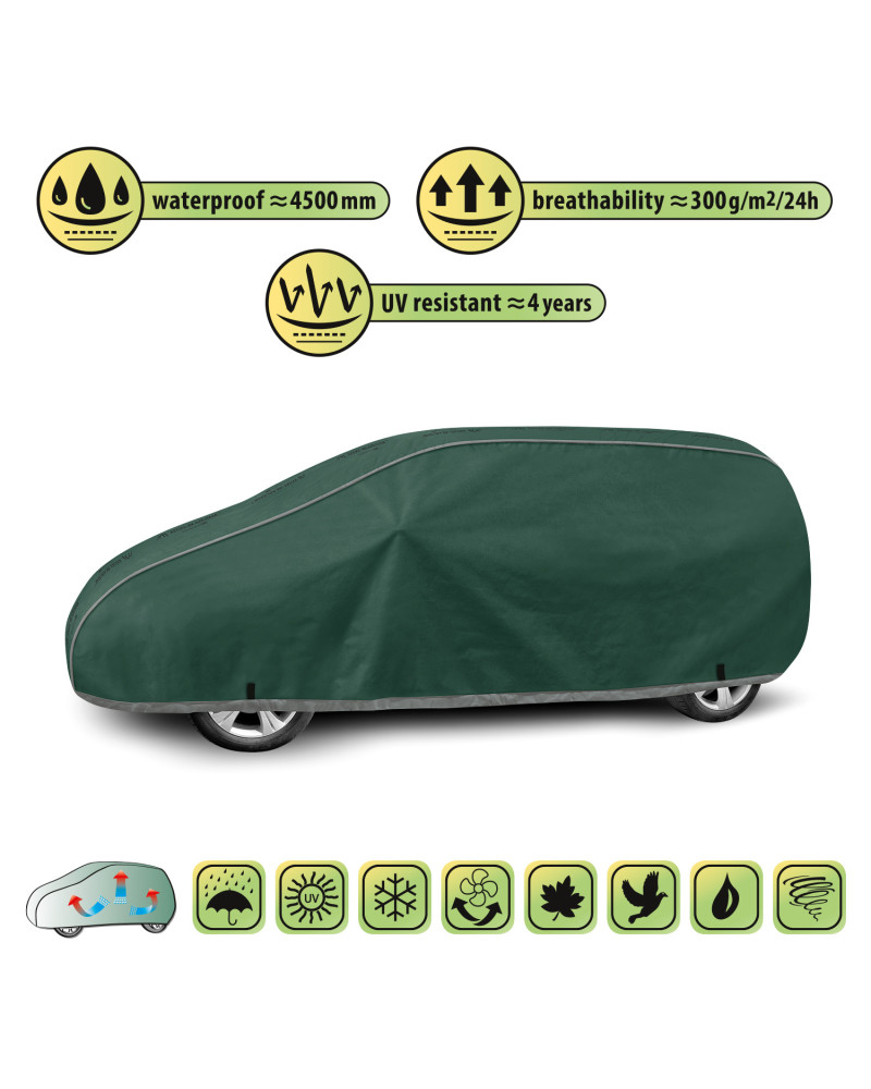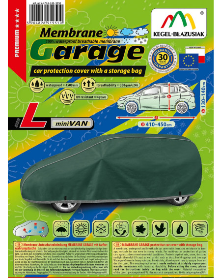 La housse de protection voiture de membrane, imperméable mais en même temps perméable à la vapeur. Housse iImperméable même en cas de forte pluie et en même temps perméable à la vapeur, évacuant l'humidité du dessous de la housse vers l'extérieur. La housse résistante aux intempéries, entièrement composée d'une membrane à très haute perméabilité à la vapeur. Elle protège contre la pluie, la neige, le gel et le rayonnement solaire (rayons UV nocifs) et contre les impuretés telles que la poussière, les fientes d'oiseaux et les sèves d’arbres.
