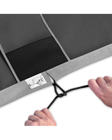 Avant de mettre la housse sur la voiture, rabattez les rétroviseurs latéraux et repliez ou dévissez l’antenne. Mettre la housse sur une voiture propre et sèche, la face imprimée vers l’extérieur. Afin de faciliter la pose correcte de la housse sur la voiture, l’étiquette FRONT est cousue à l’avant de la housse et l’étiquette REAR à l’arrière de la housse (les marquages correspondent à l’avant et à l’arrière de la voiture). Ensuite, serrez et nouez le cordon d’un bord-côtes inférieur de la housse, en prenant soin de croiser les cordons du bord-côtes et former le premier noeud avant de les serrer, et puis serrez fermement les cordons, en dirigeant les forces parallèlement au bord arrière du véhicule (voir figure 2 sur l’étiquette extérieure de la housse). Nouez les cordons du bord-côtes et vérifiez si le noeud ne se desserre pas, après avoir tiré sur le bord- côtes. Si le noeud se desserre, répétez l’action en modifiant la façon de nouer les cordons. Passez des cordons supplémentaires à travers les boucles cousues sur le bord inférieur de la housse à côté des roues de la voiture et utilisez-les pour fixer la housse aux jantes de la voiture (ne pas attacher aux enjoliveurs).